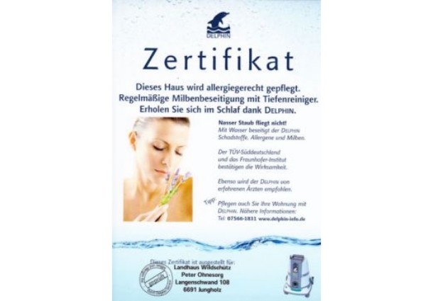 Unser Haus wird mit dem Delphin-Reinigungssystem gereinigt. Es reinigt unser wichtigstes Lebensmittel - die Luft. Saubere Luft bedeutet Kraft und Energie! Der Delphin säubert die Luft und die Oberflächen. Böden sowie Fliesen werden porentief gereinigt und somit ein weit höherer Sauberkeitseffekt erreicht. Der Delphin ist ein MUSS bei Allergien und Bronchialerkrankungen. Auch wir haben uns dafür entschieden und Ihr als Gast profitiert nun von einem ganz neuen "Sauberkeitsgefühl. Ihr werdet den Unterschied spüren...